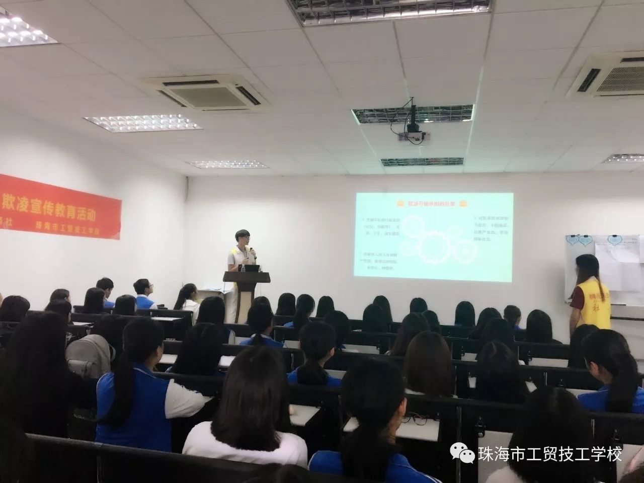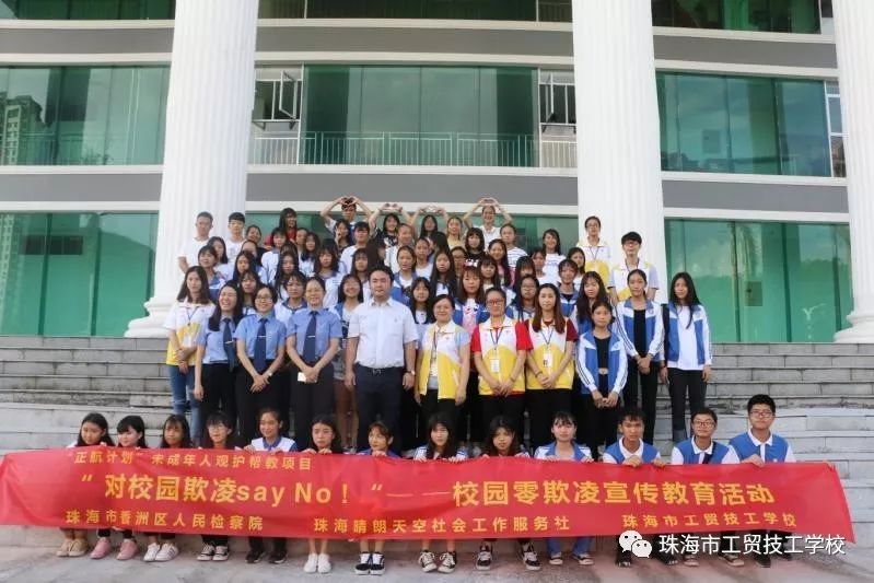 为了更好地落实上级关于校园零欺凌宣传教育的工作要求,也为了更加广泛的提升我校学生对校园欺凌现象的认识和拒绝,9月29日下午,我校举办了一场主题为“对校园欺凌say No!”——校园零欺凌宣传教育活动,这次讲座很荣幸更够邀请到珠海市香洲区人民检察院以及珠海晴朗天空社会工作服务社的相关工作人员到我校进行这次宣传教育活动。