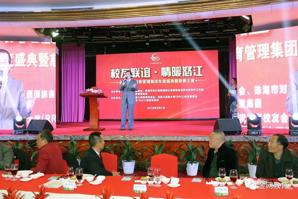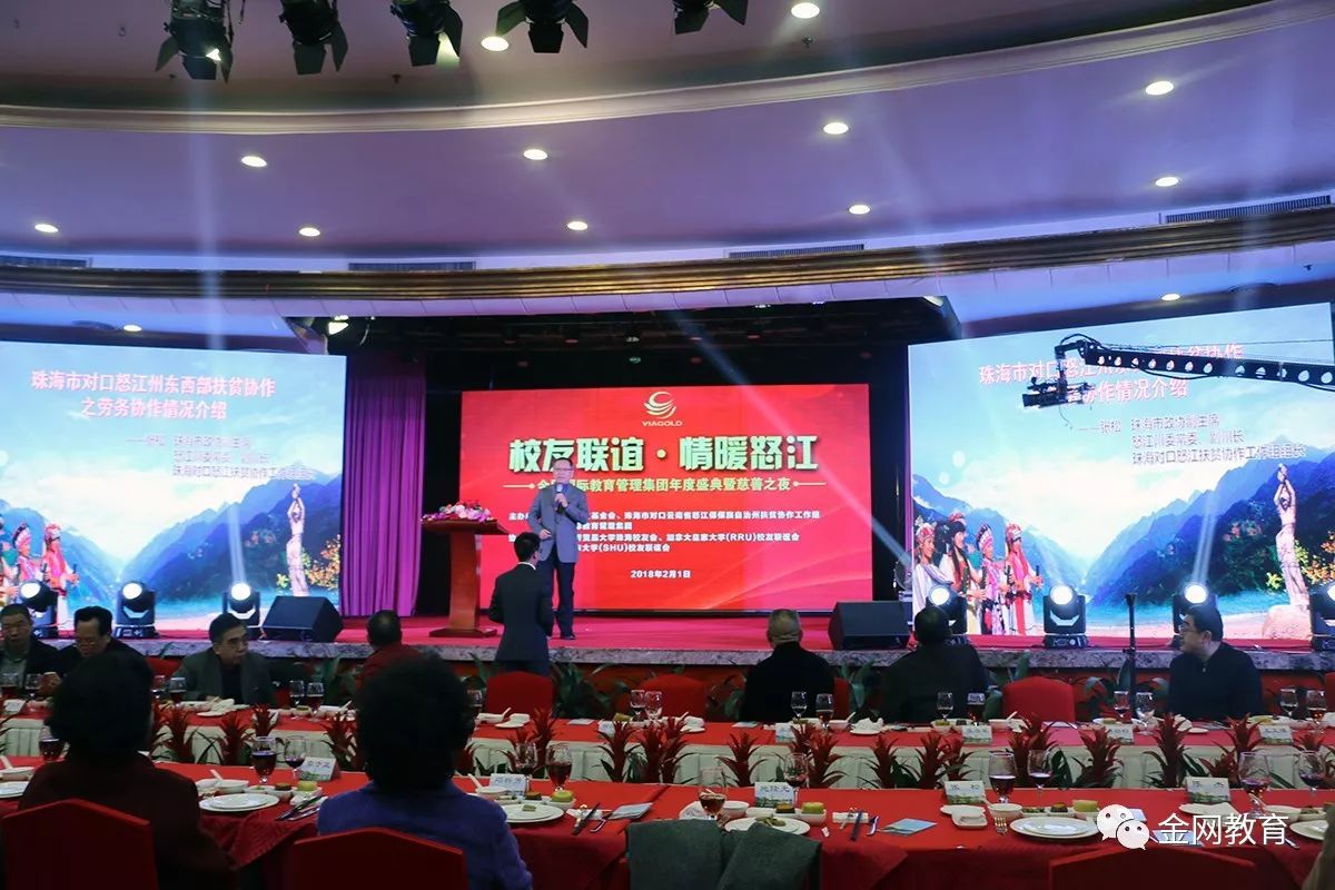 2018年2月1日晚,“校友联谊,情暖怒江” 金网国际教育管理集团年度盛典暨慈善之夜晚会在珠海度假村酒店千禧宫成功举办。广东省原副省长、广东省教育基金会理事长雷于蓝,对外经济贸易大学校长、校友总会会长王稼琼,珠海市原副市长、原人大常委会副主任邓群芳,中国民办教育协会培训专业委员会理事长张强,珠海市政协副主席、珠海驻怒江州扶贫协作工作组组长张松、珠海市原政协副主席、市扶贫基金会常务副理事长陈杰等领导以及来自各行各业的金网教育校友、企业家和爱心人士共600多人齐聚一堂,见证了这场受人瞩目的大型年度盛典暨慈善晚会活动。