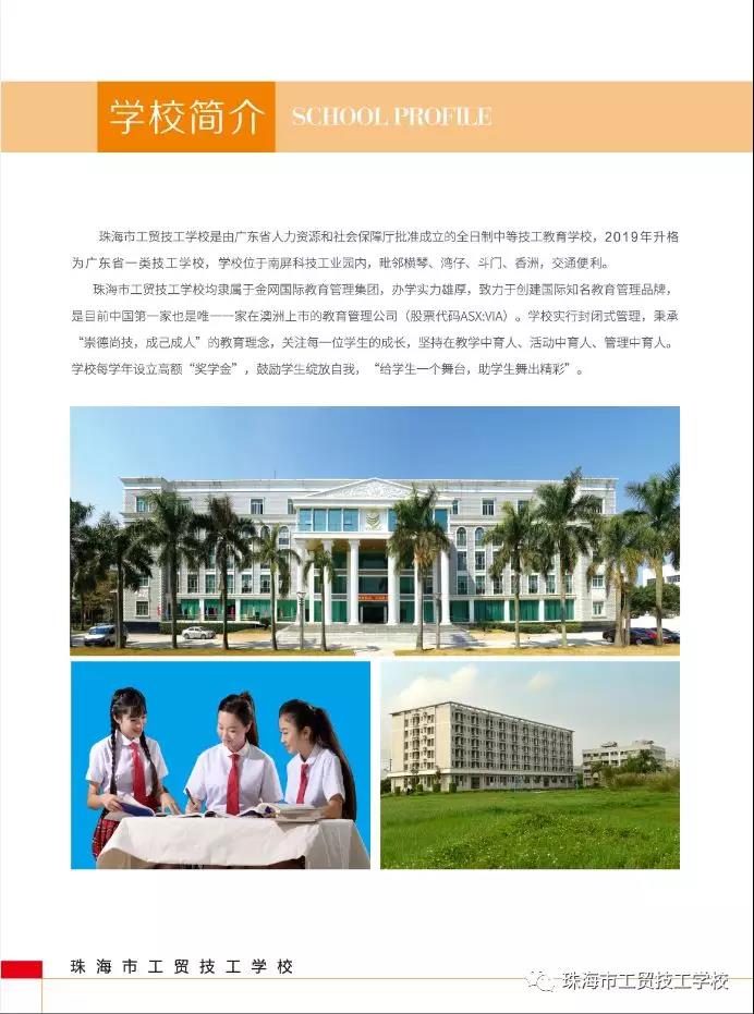 珠海市工贸技工学校隶属于金网国际教育管理集团,办学实力雄厚,致力于打造国际知名教育品牌。校实行封闭式管理,秉承“崇德尚技,成己成人”的教育理念,关注每一位学生,充分体现在教学中育人、活动中育人、管理中育人,让每一位学生找到自己才华的舞台。因材施教,严格管理,让学生在快乐中学习,让学生在规矩中成才,成长为社会所喜爱的从容、大气、技高、独立的人。学校每学年设立奖学金,鼓励学生绽放自我,“给学生一个舞台,助学生舞出精彩”。