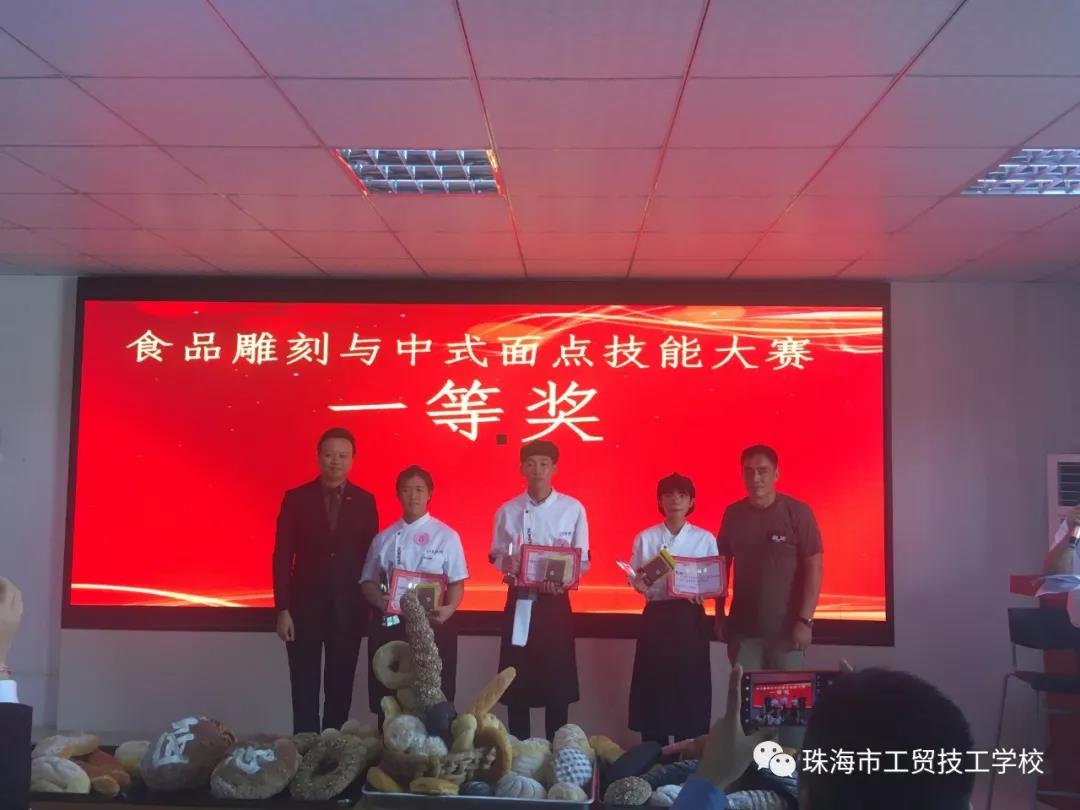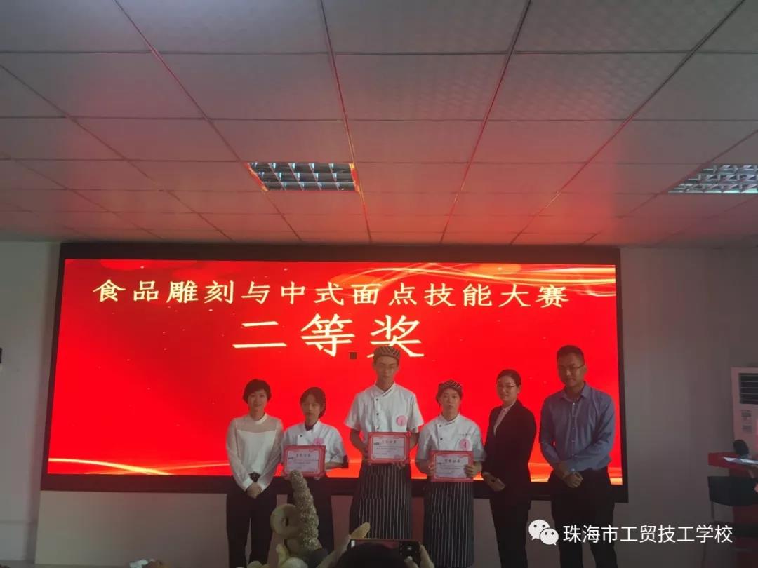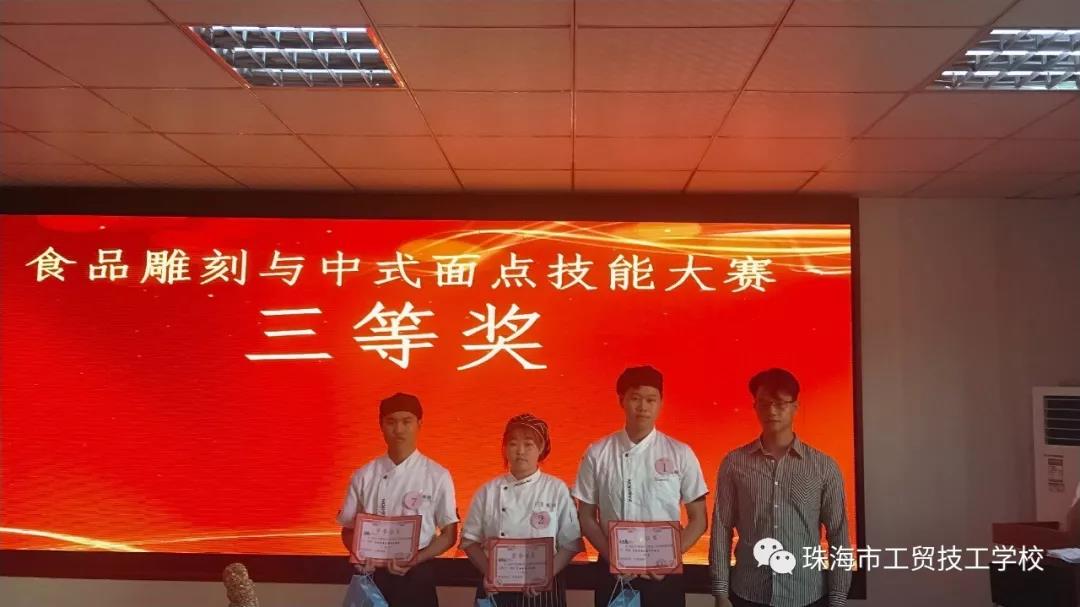 在正式比赛结束后,珠海万悦酒店人事总监杨君、人事经理向冬莉,珠海御温泉度假村人事经理谢红霞,珠海市大横琴泛旅游发展有限公司人事经理邓攀、行政总厨朱志良,珠海市工贸技工学校副校长王平分别为获奖的选手颁奖。