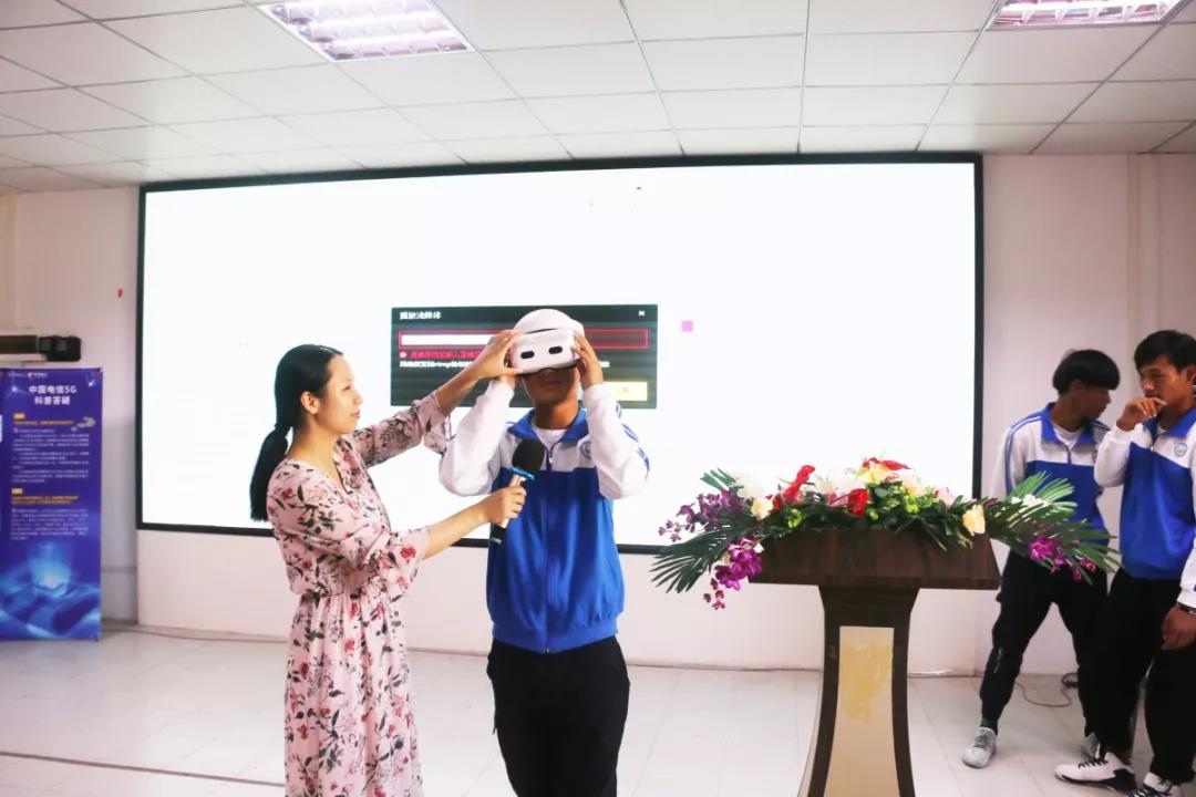 紧接着电信专家沈倩倩从 5G的特点、进程、应用以及人才需求等方面深入浅出讲解了5G的独特魅力。沈专家的讲解深深的吸引了同学们的注意力,现场掌声不断。然后,电信专家现场给我们演示无人机实时传输航拍,感受5G的速度,引起同学们阵阵尖叫。随后同学们带上VR眼镜,零距离体验5G,新奇的体验都让现场的学生不禁赞叹。交流会最后,学校领导与电信公司领导还为怒江的同学们发放了电信公司准备的大礼包,现场气氛高涨。