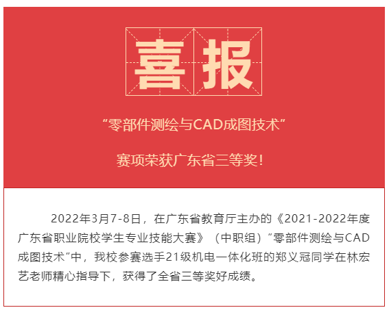 【喜报】我校学子在广东省职业院校学生专业技能大赛“零部件测绘与CAD成图技术”赛项荣获三等奖!