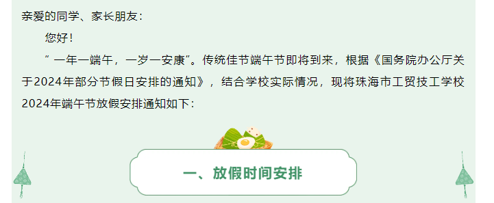 端午安康|珠海市工贸技工学校2024年端午节放假通知及温馨提示