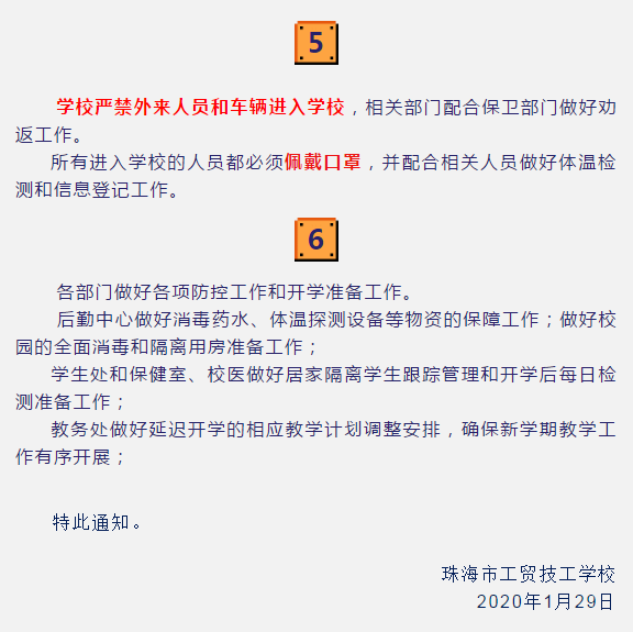 珠海市工贸技工学校关于做好延迟开学准备等工作的通知