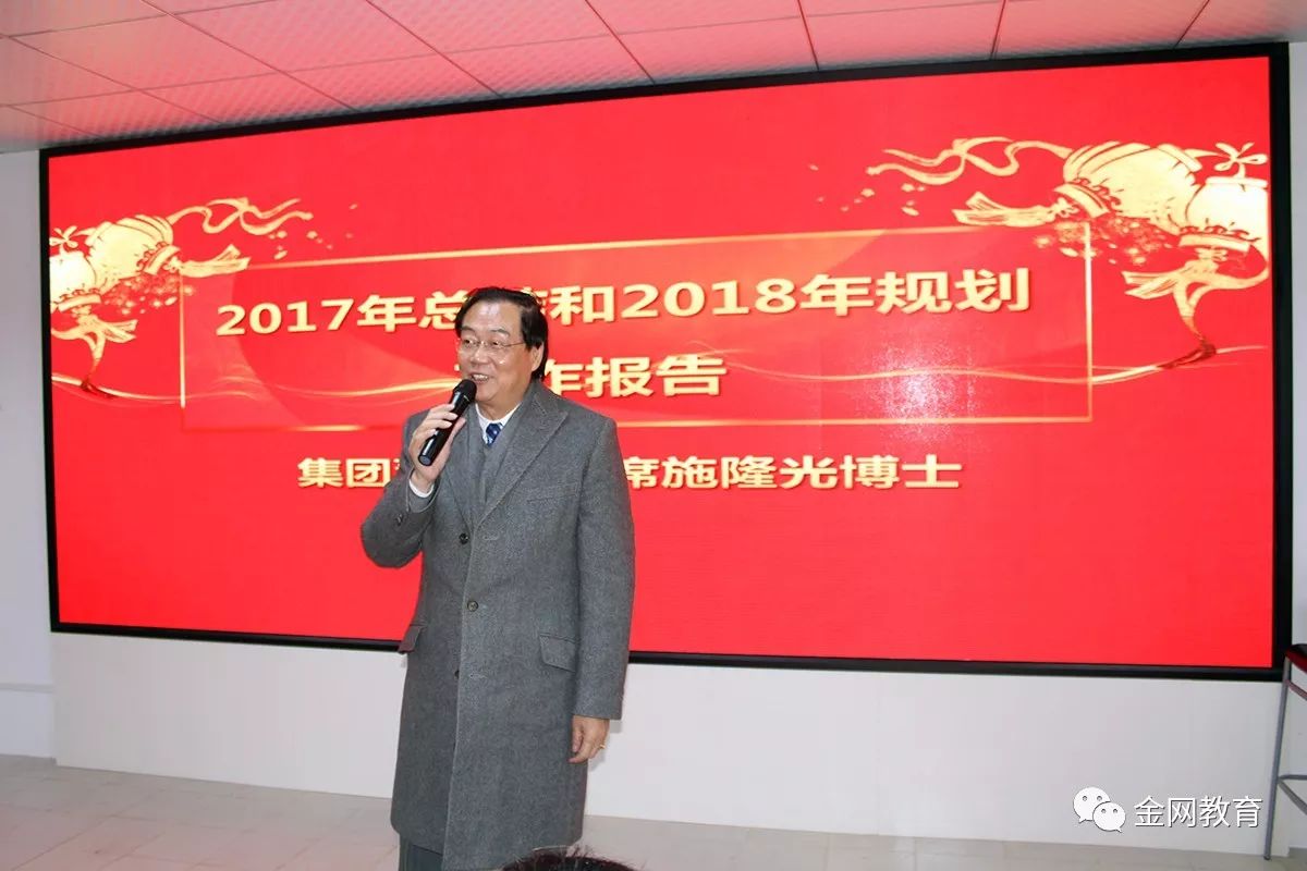 集团董事局主席施隆光博士围绕珠海片区各院校业务工作、集团党建成果、管理工作等方面对2017年的工作做了全面的总结,并对2018年工作提出要求。他指出,各院校在过去的一年里取得了优异的成绩,完成了各项任务指标,打好了跨越发展的开局之年。他希望集团全体教职员工,在2018年里以实际行动贯彻落实十九大精神,以习近平新时代中国特色社会主义思想为指引,不忘初心,为员工谋幸福,牢记使命,为集团谋发展,实现集团发展新的跨越。