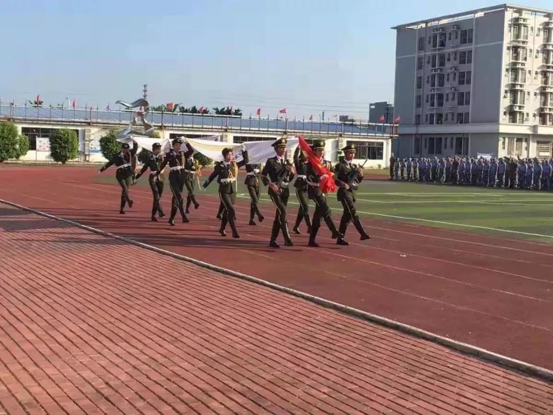 在施隆光董事长大声宣布结营仪式开始后,工贸技工学校2019级新生军训结营仪正式拉开帷幕,首先进行的是庄严而神圣的升旗仪式,工贸护旗队穿着统一的礼宾服,迈着整齐的步伐走向升旗台,伴随着庄严的义勇军进行曲,鲜艳的五星红旗冉冉升起,全场行注目礼,对祖国的敬爱之情油然而生。升国旗结束后,金网教育集团和工贸技工学校的校旗也被升起。