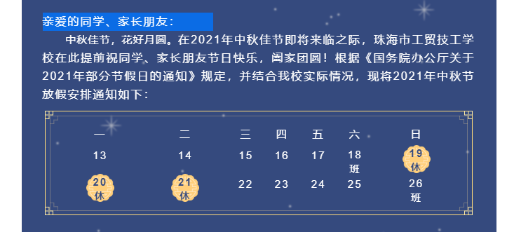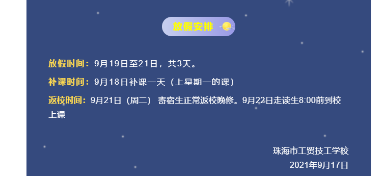 中秋佳节珠海市工贸技工学校2021年中秋节放假通知及安全注意事项