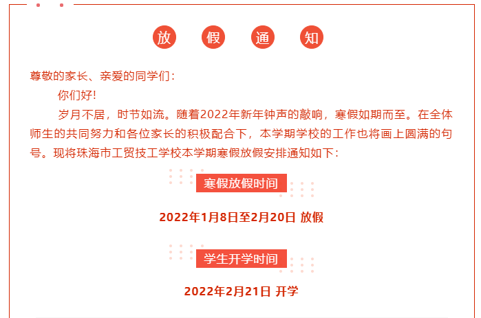 放假啦!珠海市工贸技工学校2022年寒假放假通知及安全注意事项